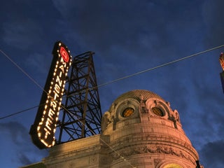 Convenient parking in H and R block garage after 6 p.m. Reserve your seats and tickets online for ease and convenience. Menu items are pricey, but comparable to all theater concessions.