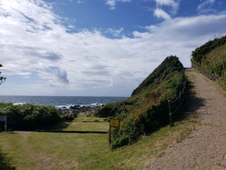 海岸の散策ルートは、奇岩、美しい地層、鎖場ありで、エキサイティングです。途中に穏やかな浜辺で一休み。満潮時には渡れないところがあるので、気をつけましょう。